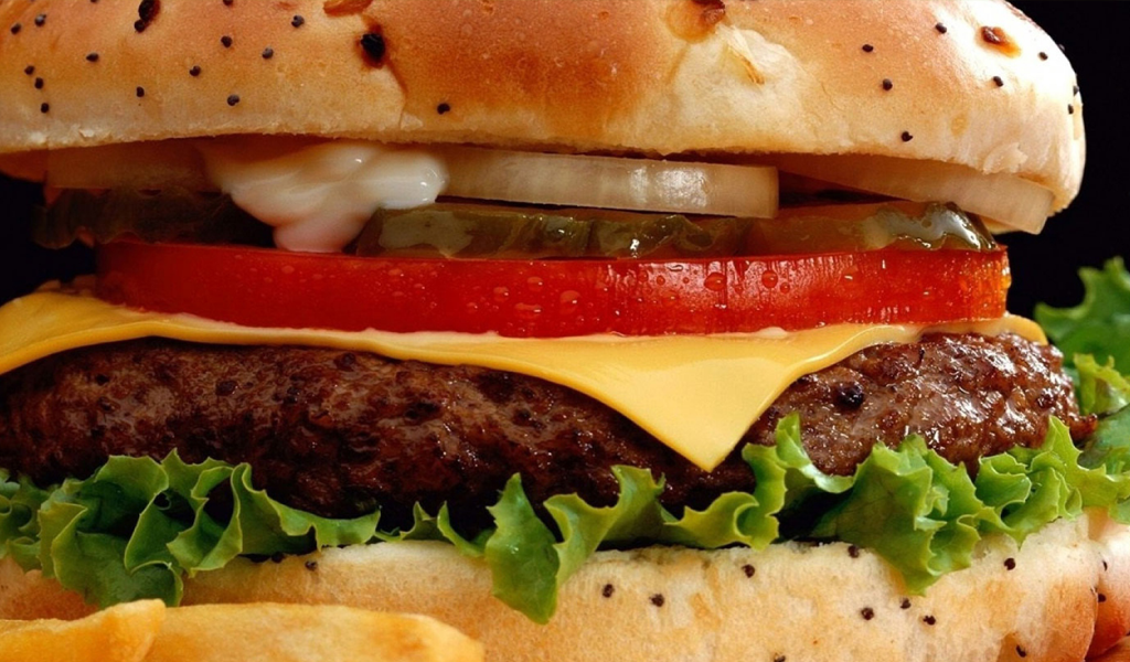 Floating Burger Isolated On Black Wooden Background Ingredients Of A Delicious Burger With Ground Beef Patty Lettuce Bacon Onions Tomatoes And Cucumbers Wall Mural Textures Themed Premium Canvas Wall Art Standard Peel